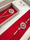 AD stone Work Bhai Bhabhi Rakhi in nice pack gift box with Mishri, Sindoor, Rice, Chandan
