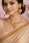 Elegant matte-finish light gold necklace set featuring intricate traditional motifs with subtle multicolor stone detailing, paired with matching statement earrings. Perfect for adding a graceful, timeless charm to any ethnic look. ✨